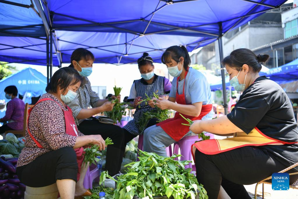 Staff members and volunteers pick vegetables at Longhua Village in Fuji Township of Luxian County, southwest China's Sichuan Province, Sept. 21, 2021. Residents from Sichuan Province who were affected by an earthquake that struck on Sept. 16 began returning home on Monday morning, as the local work priority has been shifted from emergency rescue to post-quake reconstruction. A 6.0-magnitude earthquake jolted Luxian County in the city of Luzhou at 4:33 a.m. on Sept. 16, leaving three people dead and 146 injured. (Xinhua/Xu Bingjie)