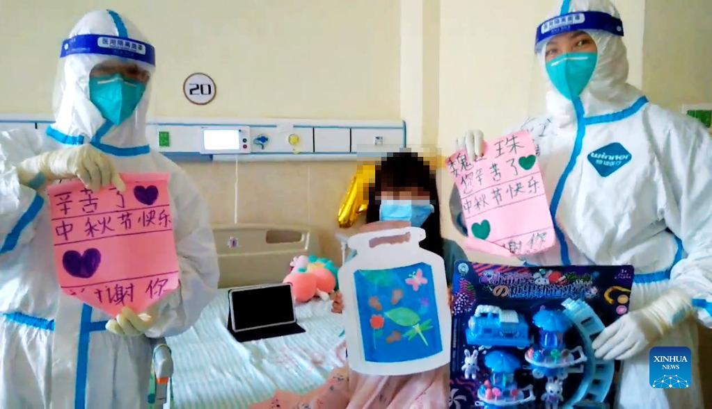 Video image captured on Sept. 21, 2021 shows a child patient who has been diagnosed with COVID-19 exchanging festival gifts and blessings with medical workers at an isolation ward of the Affiliated Hospital (Group) of Putian University in Putian, southeast China's Fujian Province. Amid the latest resurgence of COVID-19, some children have been diagnosed with the disease in Putian City. During the Mid-autumn festival, which is usually marked by family reunions, medical staff members working here played games with the child patients staying here away from their families. To make the environment child friendly, the hospital has decorated treatment wards and corridors with cartoons and adopted a targeted treatment approach with nursing and support programs. They also prepared mooncakes and toys for the young patients so as to soothe possible homesickness and the nerves. (Xinhua)