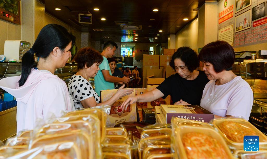 Customers select mooncakes at a Hainan-style mooncake shop in Haikou, capital of south China's Hainan Province, Sept. 19, 2021. Hainan-style mooncake combines the features of crispness and syrup golden crust. It's crispy in crust, rich in taste, sweet but not greasy. (Xinhua/Zhou Jiayi)
