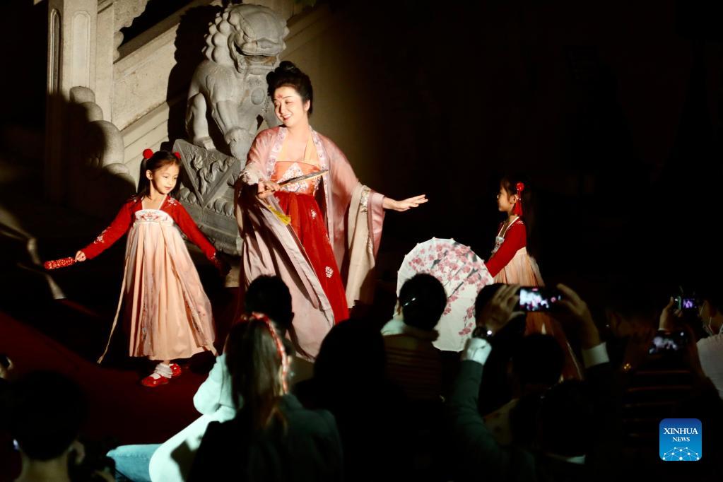 People dressed in traditional Chinese apparel perform during a special event to celebrate Mid-Autumn Festival at the USC Asian Pacific Museum in Pasadena, Los Angeles County, California, the United States, on Sept. 20, 2021. Celebrating the traditional Mid-Autumn Festival, the Sino US Performing Arts Organization held the special event featuring a fashion show and performance event inspired by Hanfu, traditional Chinese apparel, and thousands of years of evolving Chinese fashion. (Xinhua)