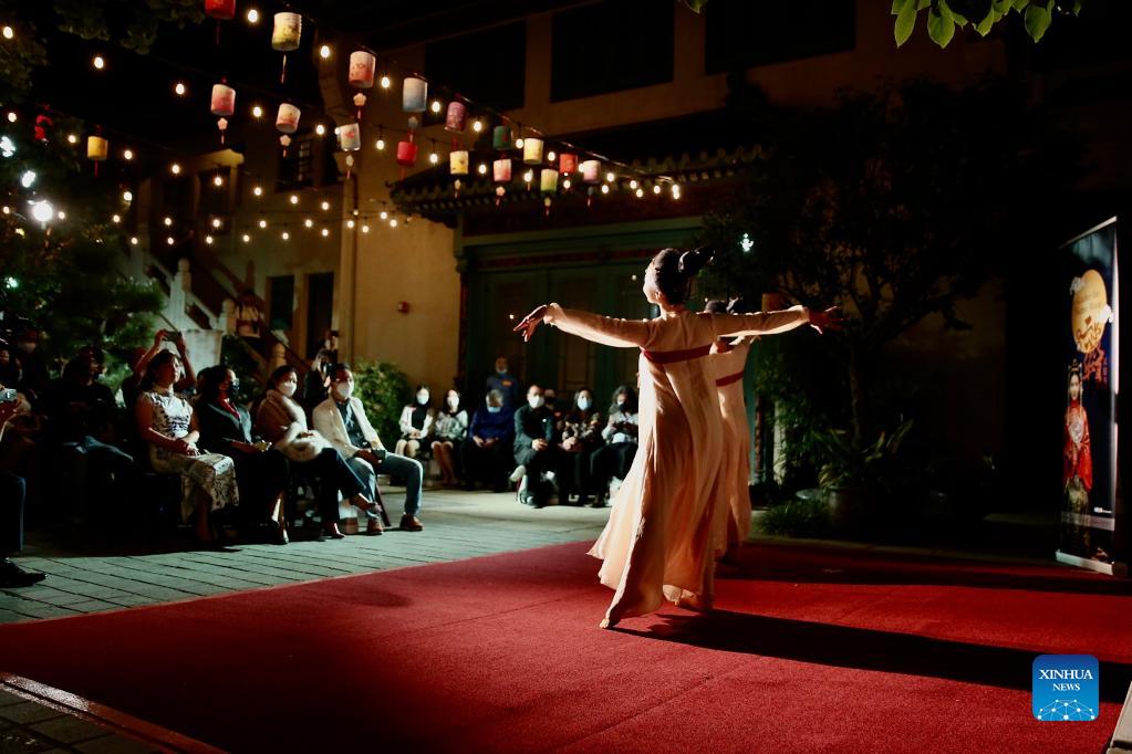 People dressed in traditional Chinese apparel perform during a special event to celebrate Mid-Autumn Festival at the USC Asian Pacific Museum in Pasadena, Los Angeles County, California, the United States, on Sept. 20, 2021. Celebrating the traditional Mid-Autumn Festival, the Sino US Performing Arts Organization held the special event featuring a fashion show and performance event inspired by Hanfu, traditional Chinese apparel, and thousands of years of evolving Chinese fashion. (Xinhua)