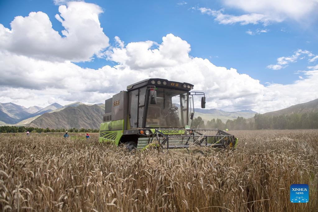 A farmer operates a harvester to reap highland barley at Kere Village of Dagze District, Lhasa, capital of southwest China's Tibet Autonomous Region, Sept. 6, 2021. (Xinhua/Sun Ruibo)