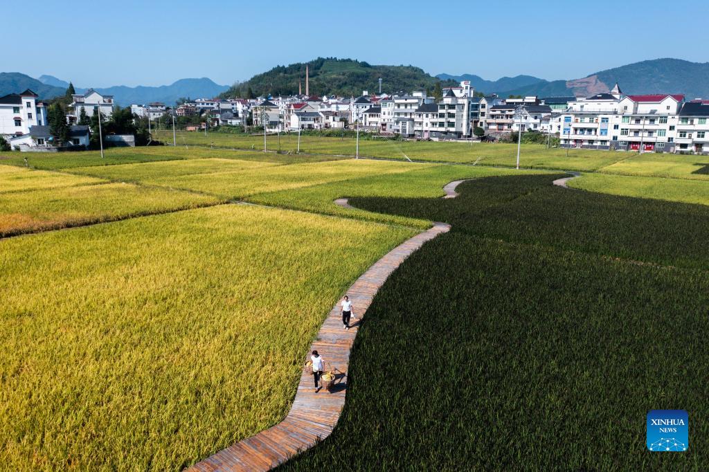 Aerial photo shows farmers participating in a rice-carrying relay game in Datong Township of Jiande, east China's Zhejiang Province, Sept. 22, 2021. A sports event themed on paddy field was held in Datong on Wednesday. The games included rice harvesting, wheelbarrow race, rice-carrying relay and tug of war. (Xinhua/Xu Yu)