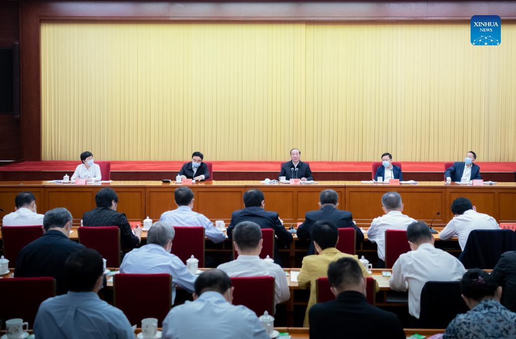 Huang Kunming, a member of the Political Bureau of the Communist Party of China (CPC) Central Committee, head of the Publicity Department of the CPC Central Committee, and also head of the leading group for the Party history learning and education campaign, speaks during a symposium of the central guidance group for the Party history learning and education campaign, in Beijing, capital of China, Sept. 22, 2021. (Xinhua/Zhai Jianlan)