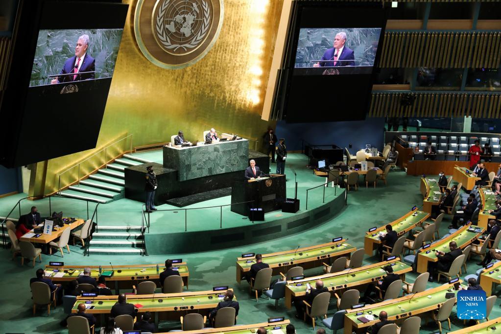 Colombian President Ivan Duque addresses the general debate of the 76th session of the United Nations General Assembly at the UN headquarters in New York, Sept. 21, 2021. The General Debate of the 76th session of the United Nations General Assembly kicked off on Tuesday. (Xinhua/Wang Ying)