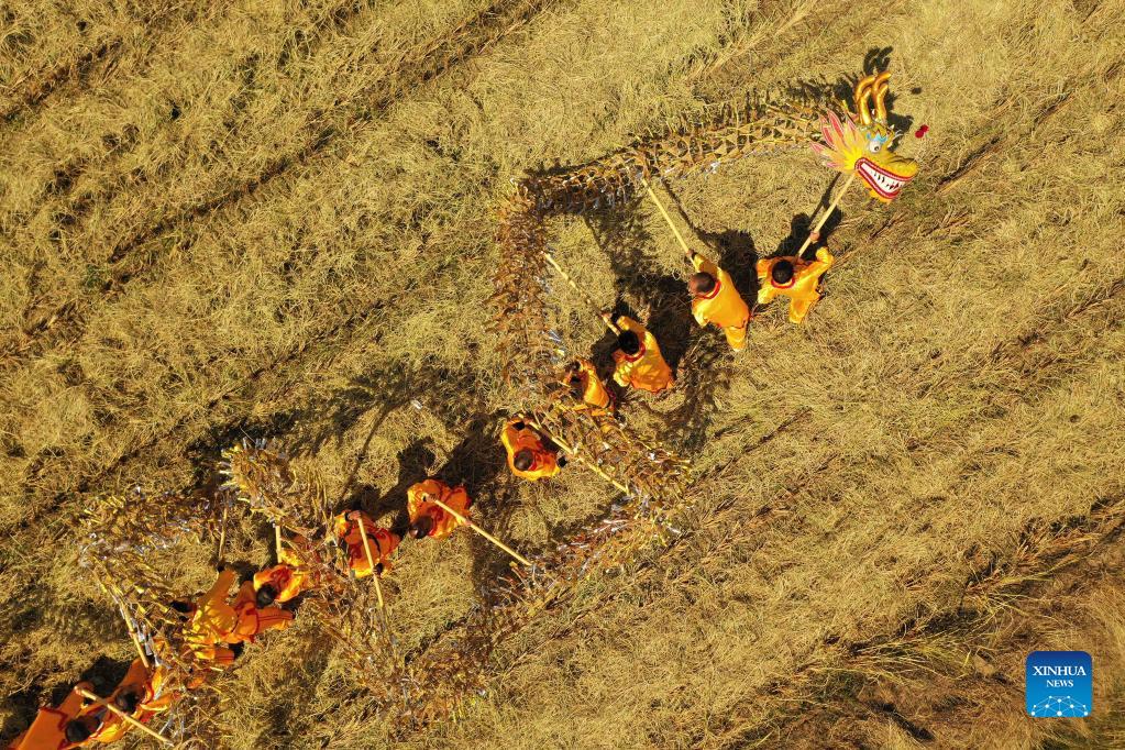 Aerial photo taken on Sept. 22, 2021 shows farmers performing dragon dance in celebration of harvest in Zongqiao Township of Hengyang City, central China's Hunan Province. (Xinhua/Zhao Zhongzhi)