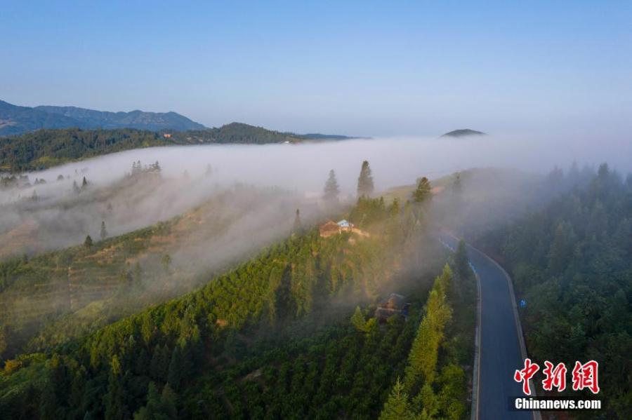 Houses, forests and roads of Datang Village, Congjiang County, southwest China's Guizhou, are covered in advection fog, Sept. 22, 2021. (China News Service/Wu Dejun)