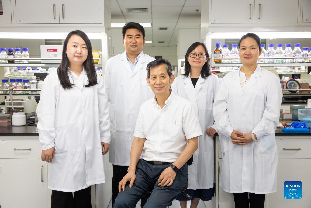 Chinese scientists Qiao Jing, Cai Tao, Ma Yanhe, Zhu Leilei, Sun Hongbing(from L to R) pose for a group photo at a lab of the Tianjin Institute of Industrial Biotechnology, Chinese Academy of Sciences, on Sept. 16, 2021. Chinese scientists have developed an artificial method of synthesizing starch from carbon dioxide, the first of its kind globally. The study, conducted by the Tianjin Institute of Industrial Biotechnology under the Chinese Academy of Sciences, was published in the journal Science on Friday. (Xinhua/Jin Liwang)