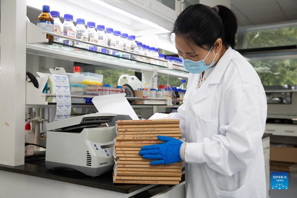 Photo taken on Sept. 16, 2021 shows a Chinese scientist arranging laboratory logs at a lab of the Tianjin Institute of Industrial Biotechnology, Chinese Academy of Sciences. Chinese scientists have developed an artificial method of synthesizing starch from carbon dioxide, the first of its kind globally. The study, conducted by the Tianjin Institute of Industrial Biotechnology under the Chinese Academy of Sciences, was published in the journal Science on Friday. (Xinhua/Jin Liwang)