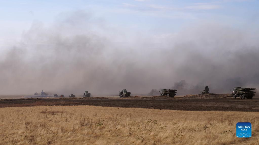 Photo taken on Sept. 23, 2021 shows the live-fire drill "Peace Mission 2021" at the Donguz training range in Orenburg, Russia. Troops participating in the "Peace Mission 2021," a counter-terrorism military exercise for Shanghai Cooperation Organization (SCO) member states, conducted a live ammunition drill at the Donguz training range in Orenburg, Russia on Thursday. (Xinhua/Mei Shixiong)