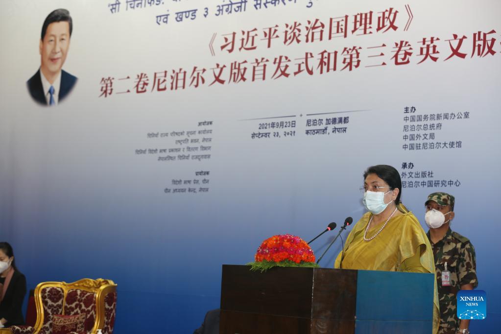 Nepali President Bidya Devi Bhandari addresses an event during which the Nepali edition of the second volume of "Xi Jinping: The Governance of China" and the English version of its third volume are released and promoted, in Kathmandu, Nepal, Sept. 23, 2021. (Xinhua/Zhou Shengping)
