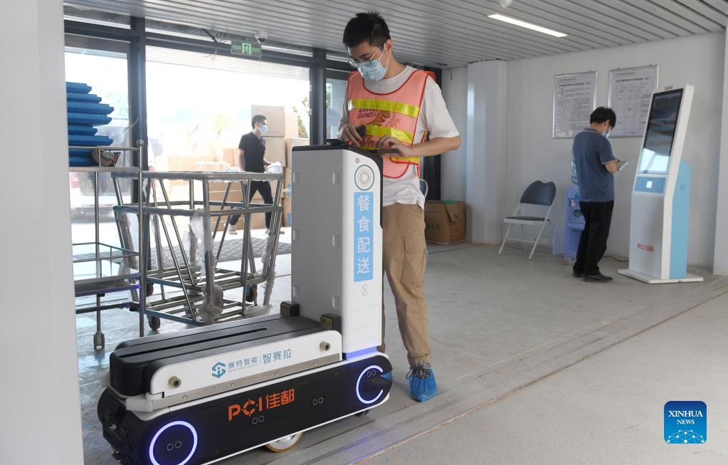 A staff member regulates a meal delivery robot at the Guangzhou International Health Station in Baiyun District, Guangzhou City of south China's Guangdong Province, on Sept. 17, 2021. The first-phase project of the Guangzhou International Health Station will be put into operation soon, offering health service to inbound travellers during their quarantine period as required by epidemic prevention and control measures. The first batch of 184 medical workers moved in on Sept. 17 to make preparations for the health service for the travellers. (Xinhua/Lu Hanxin)