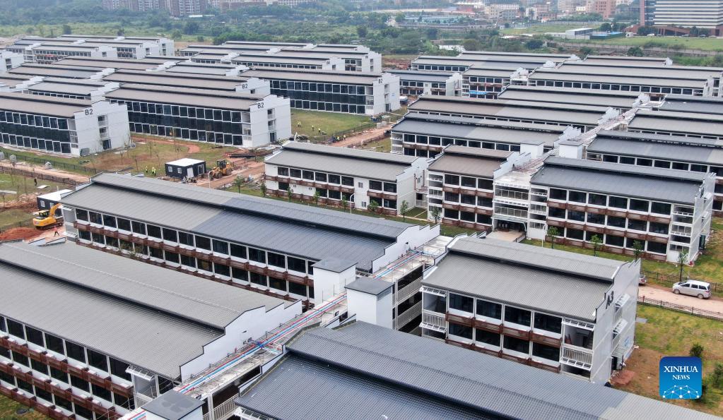 Aerial photo taken on Sept. 17, 2021 shows a view of the Guangzhou International Health Station in Baiyun District, Guangzhou City of south China's Guangdong Province. The first-phase project of the Guangzhou International Health Station will be put into operation soon, offering health service to inbound travellers during their quarantine period as required by epidemic prevention and control measures. The first batch of 184 medical workers moved in on Sept. 17 to make preparations for the health service for the travellers. (Xinhua/Lu Hanxin)