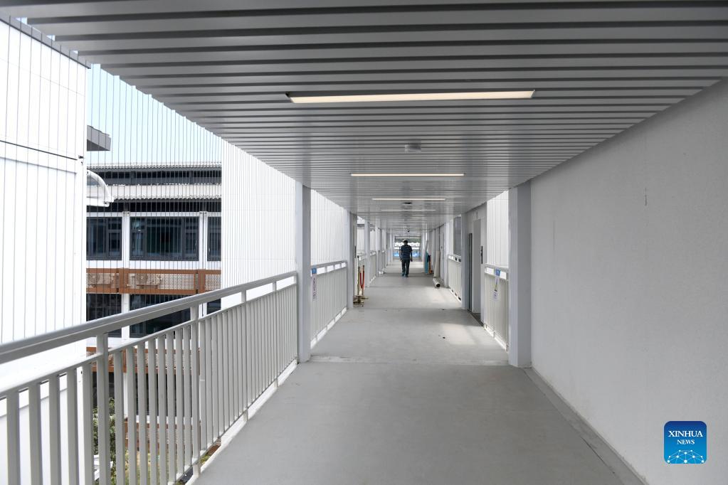 Photo taken on Sept. 17, 2021 shows an view of a passageway at the Guangzhou International Health Station in Baiyun District, Guangzhou City of south China's Guangdong Province. The first-phase project of the Guangzhou International Health Station will be put into operation soon, offering health service to inbound travellers during their quarantine period as required by epidemic prevention and control measures. The first batch of 184 medical workers moved in on Sept. 17 to make preparations for the health service for the travellers. (Xinhua/Lu Hanxin)