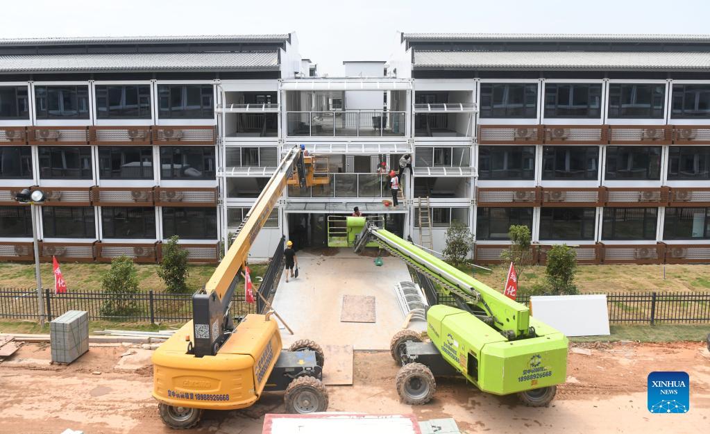Photo taken on Sept. 17, 2021 shows staff members and engineering equipment in operation for the construction of the Guangzhou International Health Station in Baiyun District, Guangzhou City of south China's Guangdong Province. The first-phase project of the Guangzhou International Health Station will be put into operation soon, offering health service to inbound travellers during their quarantine period as required by epidemic prevention and control measures. The first batch of 184 medical workers moved in on Sept. 17 to make preparations for the health service for the travellers. (Xinhua/Lu Hanxin)