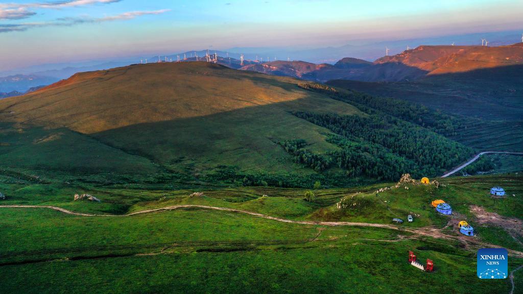 Aerial photo taken on Sept. 23, 2021 shows a view of an alpine meadow in Liuke Township, Lingqiu County, Datong City of north China's Shanxi Province. (Photo by Li Tao/Xinhua)