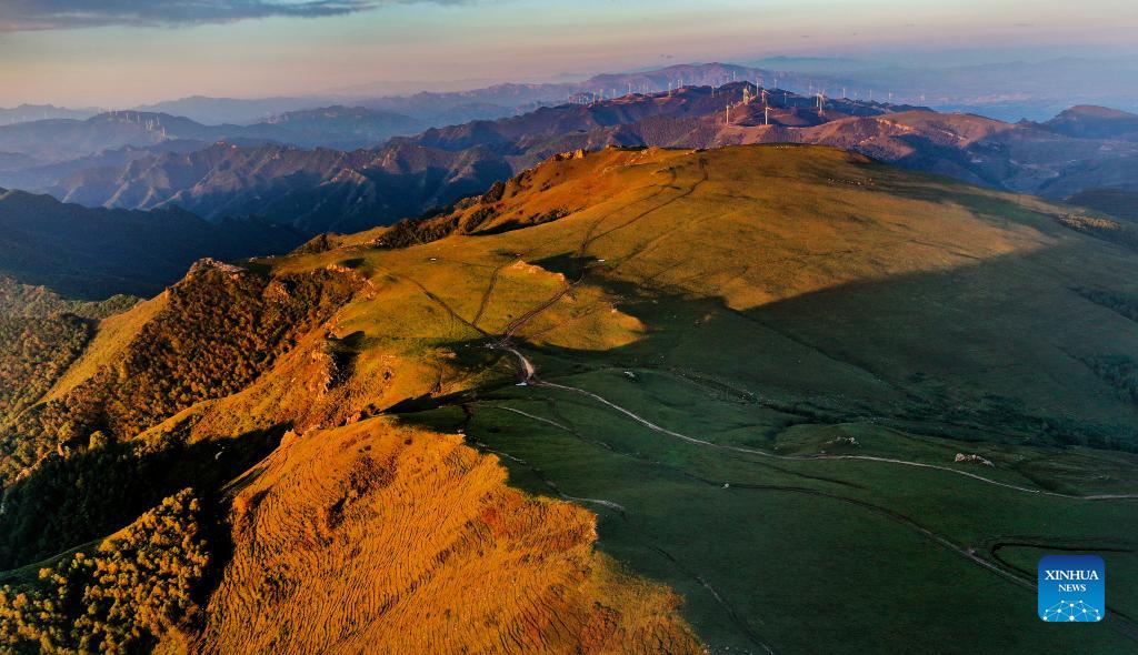 Aerial photo taken on Sept. 23, 2021 shows a view of an alpine meadow in Liuke Township, Lingqiu County, Datong City of north China's Shanxi Province. (Photo by Li Tao/Xinhua)