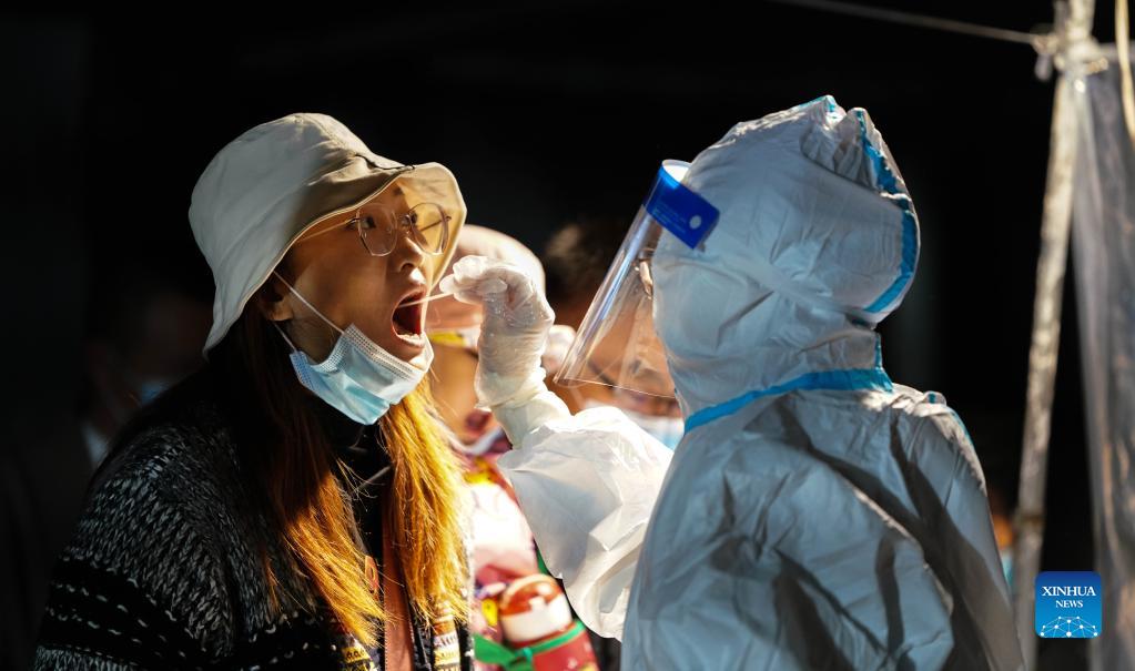 A resident receives a nucleic acid test at a testing point in Harbin, northeast China's Heilongjiang Province, Sept. 22, 2021. Harbin, with a population of more than 10 million, launched citywide nucleic acid testing on Tuesday afternoon and plans to complete the campaign by the end of Thursday, according to the city's COVID-19 prevention and control headquarters. (Xinhua/Wang Song)