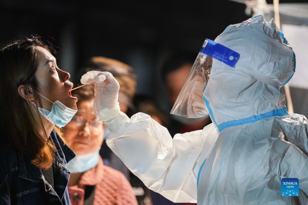 A resident receives a nucleic acid test at a testing point in Harbin, northeast China's Heilongjiang Province, Sept. 22, 2021. Harbin, with a population of more than 10 million, launched citywide nucleic acid testing on Tuesday afternoon and plans to complete the campaign by the end of Thursday, according to the city's COVID-19 prevention and control headquarters. (Xinhua/Wang Song)