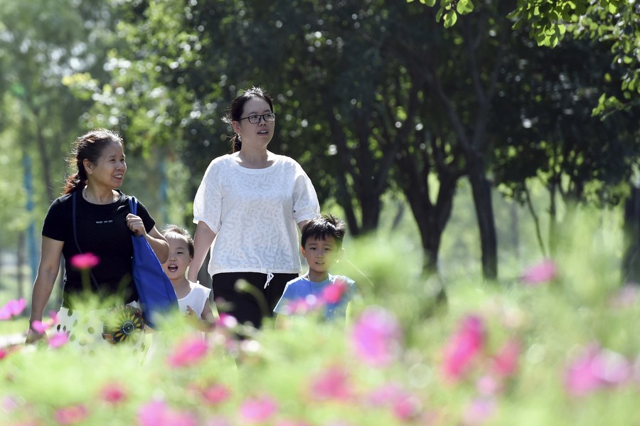 Tourists take a walk at Xinghuagou wetland park transformed from the mining subsidence area of Jingxing in Shijiazhuang, north China's Hebei Province, Aug. 24, 2021. (Xinhua/Luo Xuefeng)