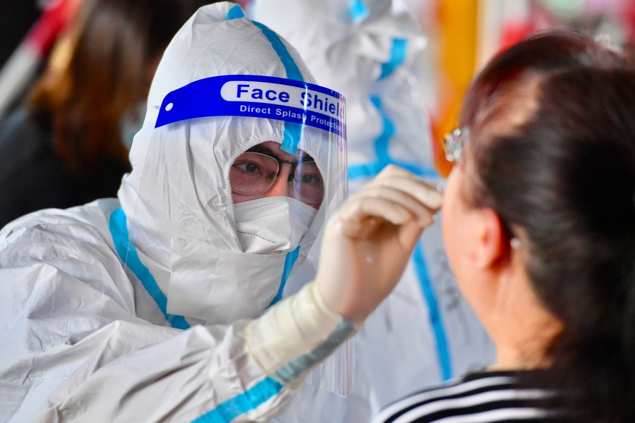 A staff member takes a swab sample for nucleic acid test at a testing point in Siming District of Xiamen, east China's Fujian Province, Sept. 22, 2021. (Xinhua/Jiang Kehong)