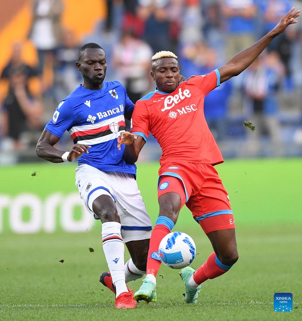 Napoli's Victor Osimhen (R) vies with Sampdoria's Omar Colley during a Serie A football match between Napoli and Sampdoria in Genova, Italy on Sept. 23, 2021. (Str/Xinhua)