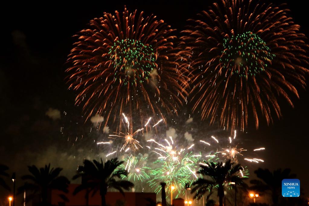 Photo taken on Sept. 23, 2021 shows the national day firework in the sky nearby the Al Diriyah in Riyadh, Saudi Arabia. (Xinhua/Wang Haizhou)
