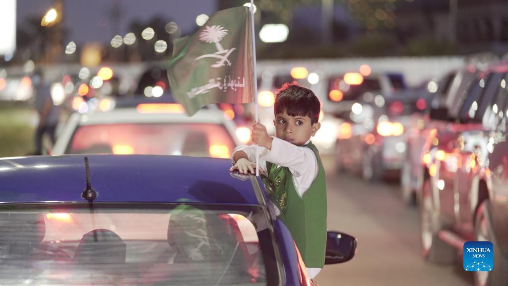 A child leans out of the car window to watch the national day firework show in Dammam, Saudi Arabia, Sept. 23, 2021. (Xinhua/Mohamed Nasr)