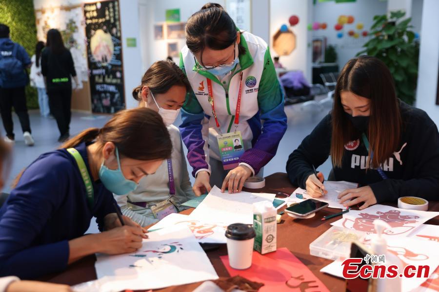 Hong Kong athletes try Shaanxi paper-cuts in the 14th National Games Village, Xi’an City of northwest China’s Shaanxi Province, Sept. 24, 2021. (China News Service/Jiang Qiming)
