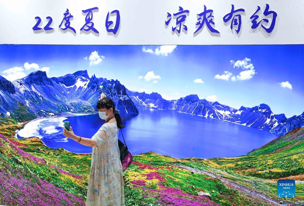 A visitor takes selfie at the booth of Changbai Mountain at the 13th China-Northeast Asia Expo in Changchun, northeast China's Jilin Province, on Sept. 24, 2021. The 13th China-Northeast Asia Expo is held online and offline from Sept. 23 to 27 in Changchun, capital city of northeast China's Jilin Province. (Xinhua/Xu Chang)