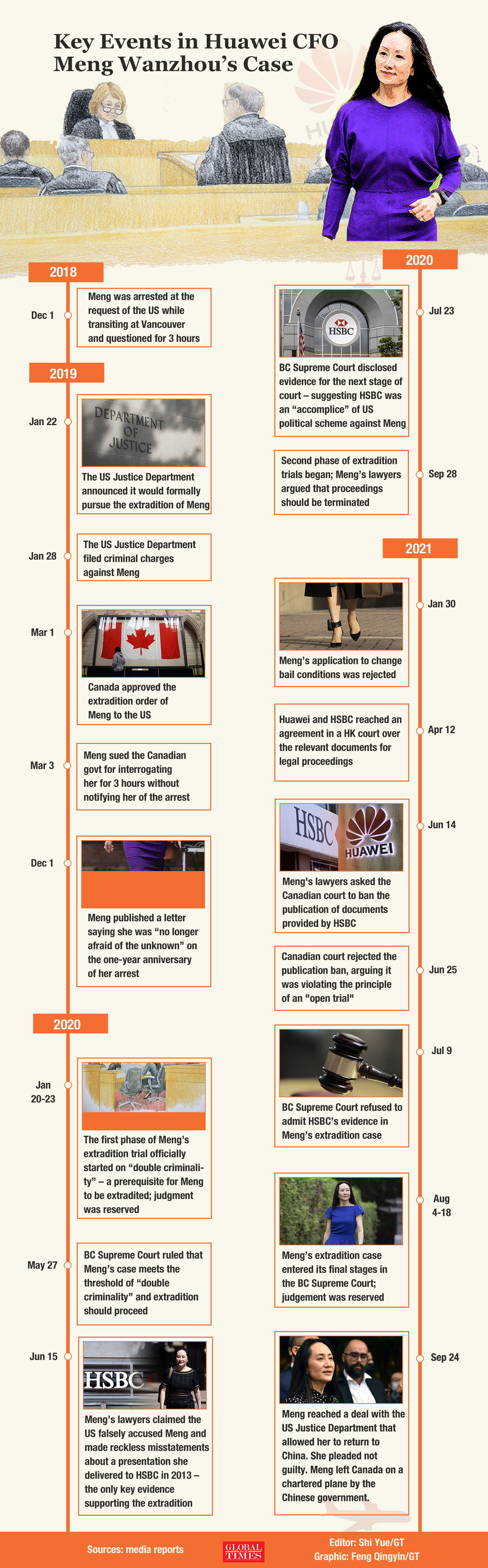 Key events in Huawei CFO Meng Wanzhou's case. Graphic: GT