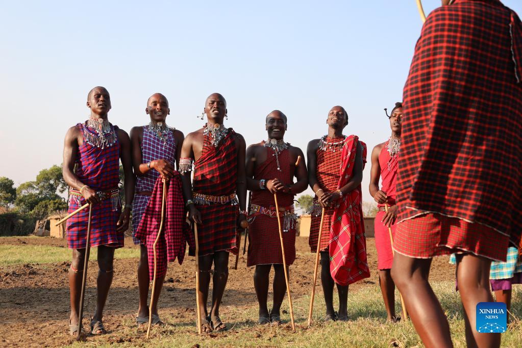 Maasai people perform at Maasai tribe near the Maasai Mara National Reserve, Kenya, Aug. 29, 2021. (Xinhua/Dong Jianghui)