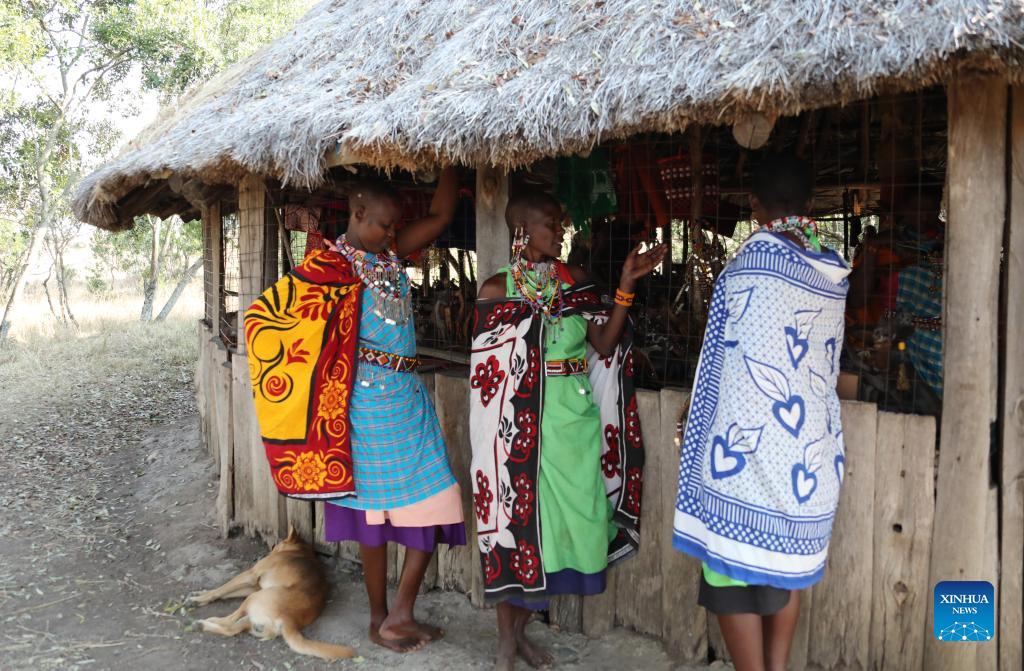 Maasai people are seen outside a shop at Maasai tribe near the Maasai Mara National Reserve, Kenya, Aug. 29, 2021. (Xinhua/Dong Jianghui)