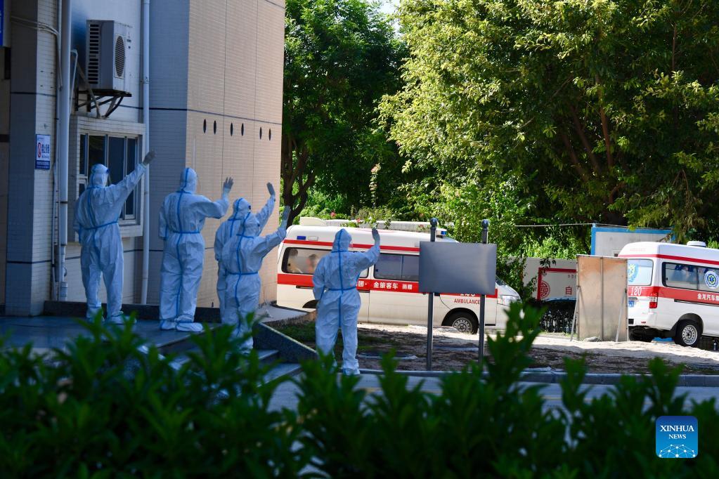 Medical workers wave goodbye to patients recovered from COVID-19 in Xiamen, east China's Fujian Province, on Sept. 25, 2021. Seven COVID-19 patients were discharged from hospital in the city of Xiamen, east China's Fujian Province, on Saturday after recovery. This is the first batch of patients released since cluster infections of Delta variant occurred in the city earlier this month, according to local authorities. (Xinhua/Jiang Kehong)