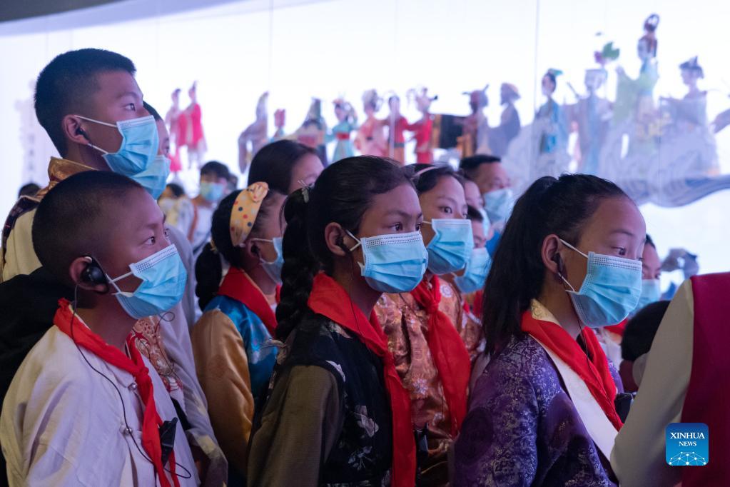 A group of students from Riwoqe County of southwest China's Tibet Autonomous Region visit the Chengdu Museum in Chengdu, southwest China's Sichuan Province, Sept. 23, 2021. At the beginning of this new semester, 15 Tibetan students, accompanied by their teachers, started a class trip sponsored by a student aid fund that rewards and supports students from poor families with excellent academic performance in Riwoqe County, southwest China's Tibet Autonomous Region. At the first stop of the project this year, the students visited Chengdu Museum and made some handicrafts. They will visit Beijing and Tianjin later during this year's trip. Since it was started in 2014, the public welfare project has benefited more than 100 students and teachers from 15 primary and middle schools in Riwoqe. (Xinhua/Tang Wenhao)