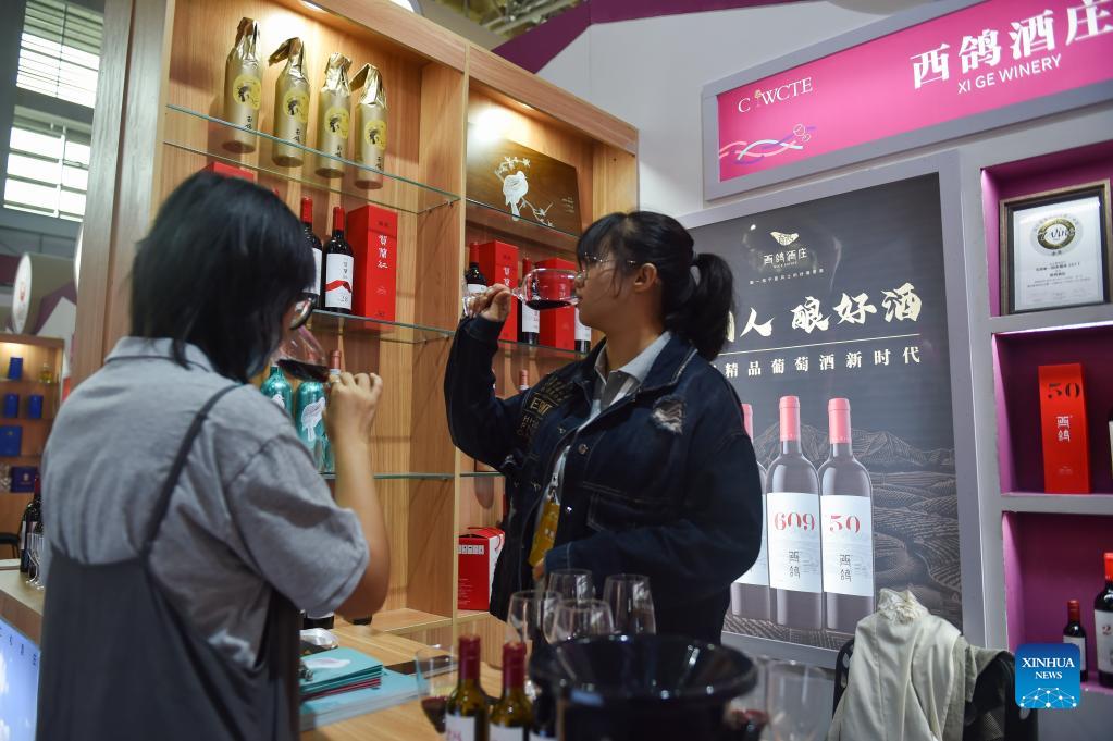 Visitors taste wine at the first China (Ningxia) International Wine Culture and Tourism Expo in Yinchuan, northwest China's Ningxia Hui Autonomous Region, Sept. 25, 2021. The first China (Ningxia) International Wine Culture and Tourism Expo is held from Sept. 25 to 27. (Xinhua/Tang Rufeng)