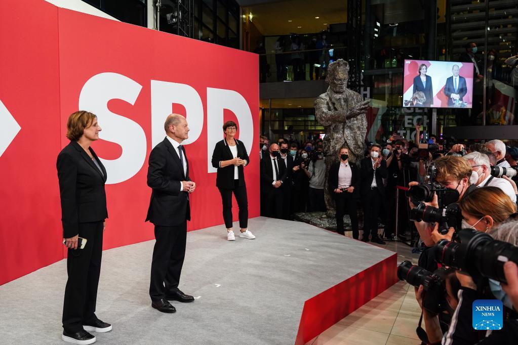 Chancellor candidate of Germany's Social Democratic Party (SPD) Olaf Scholz (2nd L) attends a rally at the SPD headquarters in Berlin, Germany, on Sept. 26, 2021. Germany's center-left Social Democratic Party led by the incumbent Vice Chancellor and Finance Minister Olaf Scholz, won about 26 percent of the vote in the federal election on Sunday, according to the preliminary exit poll released by German media ZDF. (Photo by Stefan Zeitz/Xinhua)