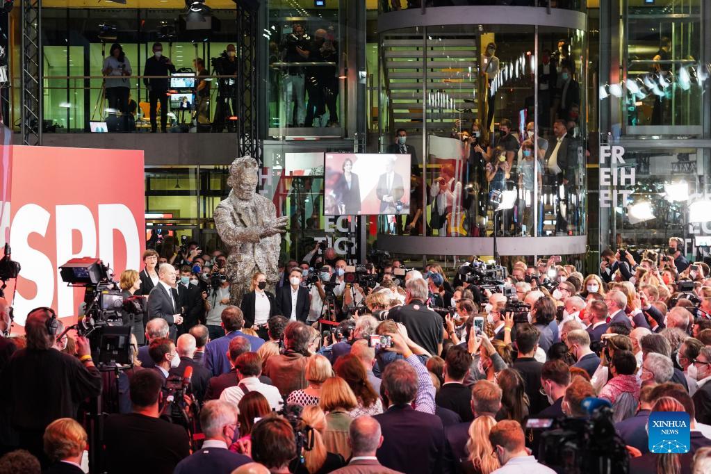 People attend a rally at the headquarters of Germany's Social Democratic Party (SPD) in Berlin, Germany, on Sept. 26, 2021. Germany's center-left Social Democratic Party led by the incumbent Vice Chancellor and Finance Minister Olaf Scholz, won about 26 percent of the vote in the federal election on Sunday, according to the preliminary exit poll released by German media ZDF. (Photo by Stefan Zeitz/Xinhua)