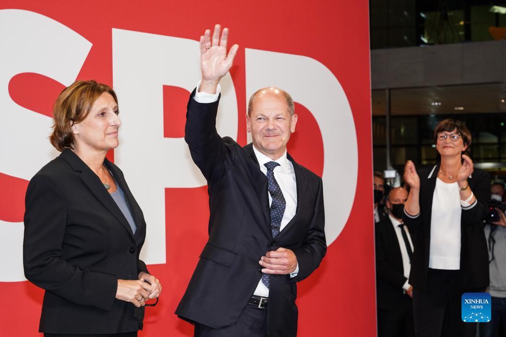 Chancellor candidate of Germany's Social Democratic Party (SPD) Olaf Scholz (2nd L) attends a rally at the SPD headquarters in Berlin, Germany, on Sept. 26, 2021. Germany's center-left Social Democratic Party led by the incumbent Vice Chancellor and Finance Minister Olaf Scholz, won about 26 percent of the vote in the federal election on Sunday, according to the preliminary exit poll released by German media ZDF. (Photo by Stefan Zeitz/Xinhua)