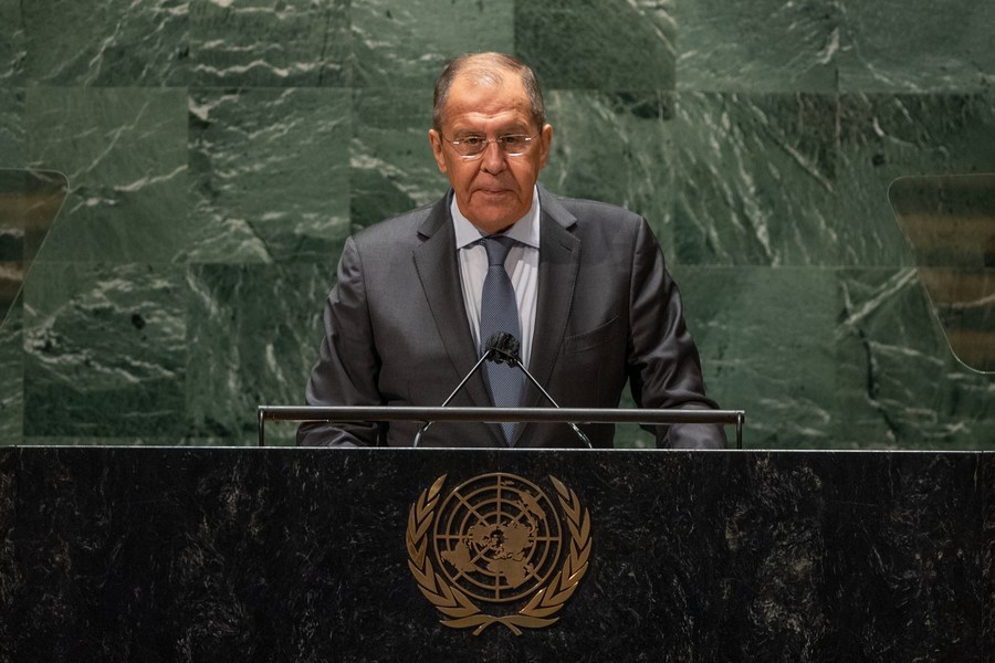 Russian Foreign Minister Sergei Lavrov addresses the general debate of the 76th session of the United Nations General Assembly (UNGA) at the UN headquarters in New York, Sept. 25, 2021. (Cia Pak/UN Photo/Handout via Xinhua)