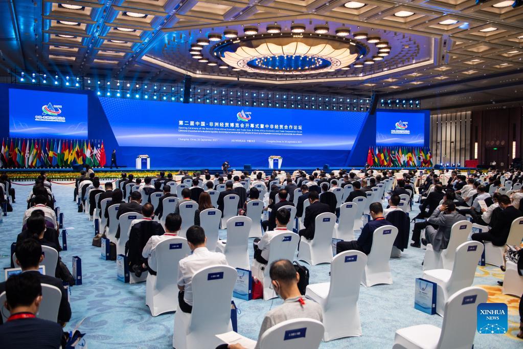 Photo taken on Sept. 26, 2021 shows a view of the opening ceremony of the second China-Africa Economic and Trade Expo &China-Africa Economic and Trade Cooperation Forum held in Changsha, central China's Hunan Province. The four-day event, online and offline, themed "New Start, New Opportunities, and New Accomplishments," has attracted nearly 900 enterprises from nearly 40 African countries and China, according to the organizers. (Xinhua/Chen Sihan)