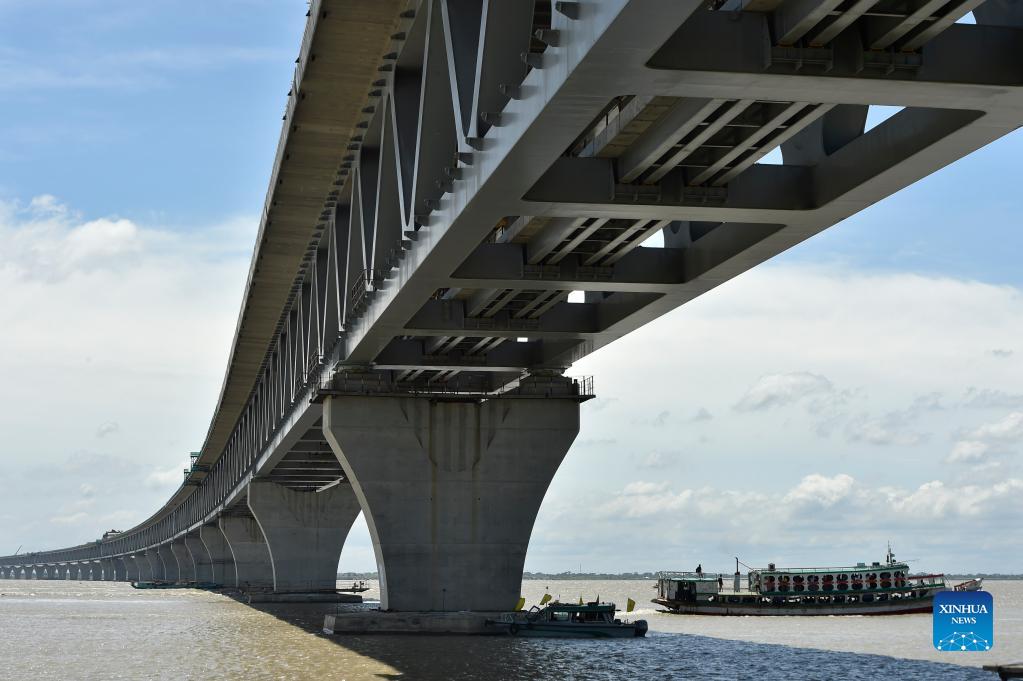 Photo taken on Sept. 12, 2021 shows a view of Padma Multipurpose Bridge Project under construction in Munshiganj on the outskirts of Dhaka, Bangladesh. For Bangladeshis, a dream is coming true. The history of crossing the mighty Padma river between dozens of districts in southern Bangladesh and the capital of Dhaka only by ferries or boats is all set to end. The mega multipurpose road-rail bridge dubbed the "Dream Padma Bridge" of Bangladesh is nearing completion after workers overcame tons of hurdles, including challenges brought by the COVID-19 pandemic. The huge infrastructure, with the main bridge spanning 6.15 km in length, is undertaken by China Railway Major Bridge Engineering Group Co, Ltd (MBEC). It is the largest and most challenging infrastructure project in Bangladesh's history. (Xinhua)