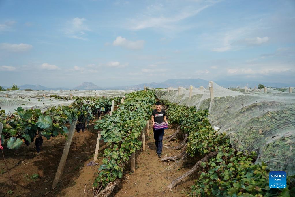 A villager transfers grapes in Wenquantun Township, Zhuolu County, north China's Hebei Province, Sept. 26, 2021. Autumn is the harvest season for grapes on the 80,000 mu (about 5,333 hectares) of grape fields in the county. (Xinhua/Mu Yu)