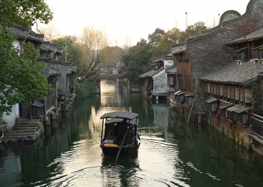 A man paddles a boat in Wuzhen, east China's Zhejiang Province, Jan. 11, 2021. (Xinhua/Weng Xinyang)