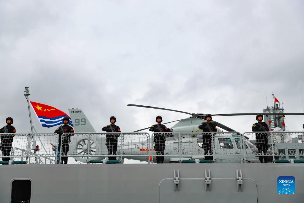 The 39th fleet of the Chinese People's Liberation Army (PLA) Navy sets out to conduct an escort mission in the Gulf of Aden and the waters off Somalia, at a port in Qingdao, east China's Shandong Province, Sept. 26, 2021. The fleet is composed of the guided-missile destroyer Urumqi, the missile frigate Yantai, and the supply ship Taihu, with dozens of special-operations soldiers and two helicopters on board. The PLA Navy began conducting escort missions in the Gulf of Aden and the waters off Somalia in December 2008. (Photo by Liu Zaiyao/Xinhua)