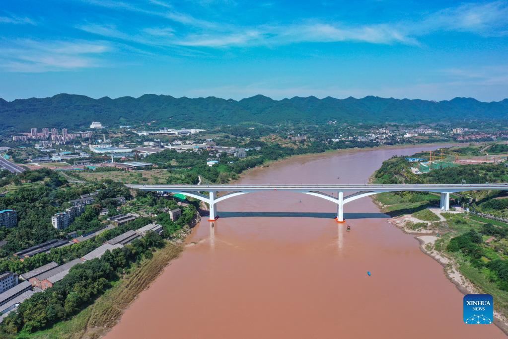 Aerial photo taken on Sept. 26, 2021 shows Lijia Jialing River Bridge in southwest China's Chongqing. With a total length of 785 meters, the Lijia Jialing River Bridge is expected to start operation before the upcoming National Day holiday. (Xinhua/Huang Wei)