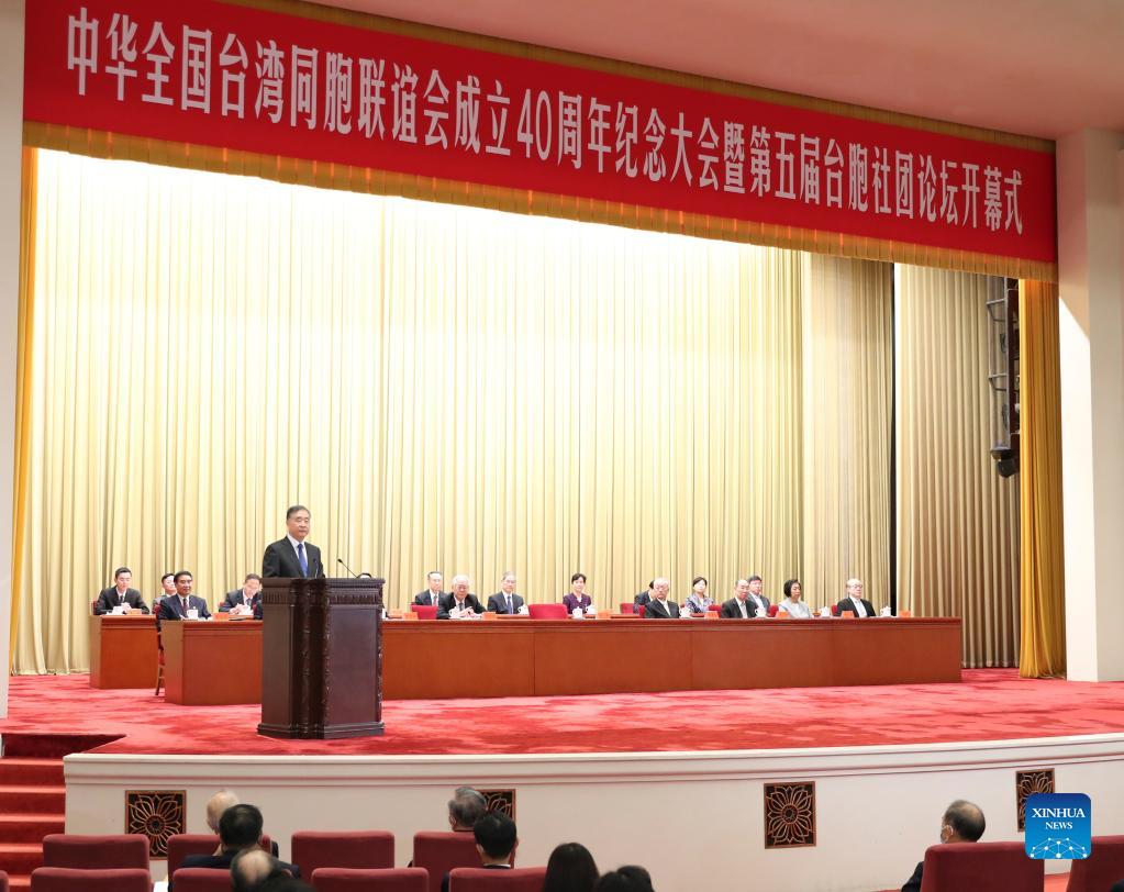 Wang Yang, a member of the Standing Committee of the Political Bureau of the Communist Party of China (CPC) Central Committee and chairman of the Chinese People's Political Consultative Conference National Committee, speaks at a commemorative meeting to mark the 40th anniversary of the founding of the All-China Federation of Taiwan Compatriots (ACFTC), and the opening of the fifth forum of social groups of Taiwan compatriots, in Beijing, capital of China, Sept. 26, 2021. (Xinhua/Ding Haitao)