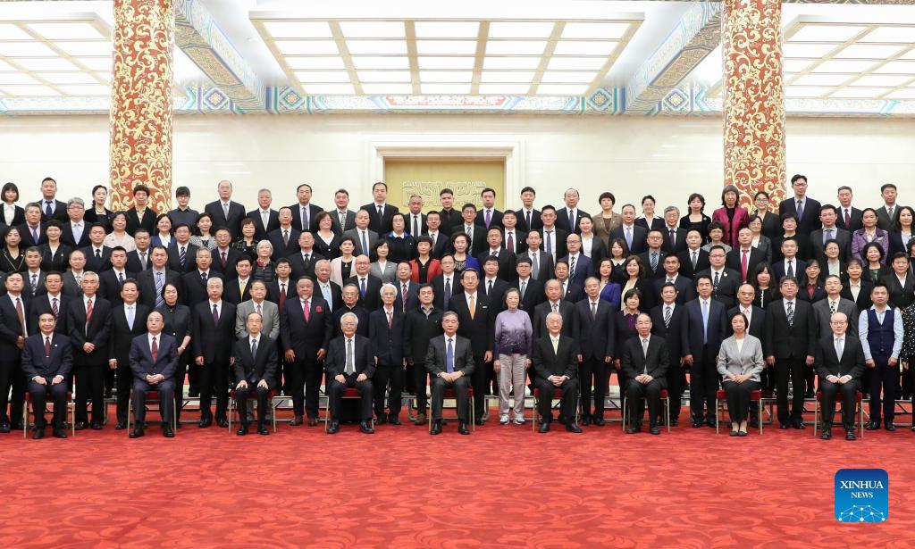 Wang Yang, a member of the Standing Committee of the Political Bureau of the Communist Party of China (CPC) Central Committee and chairman of the Chinese People's Political Consultative Conference National Committee, poses for a group photo with participants of a commemorative meeting to mark the 40th anniversary of the founding of the All-China Federation of Taiwan Compatriots (ACFTC), and the opening of the fifth forum of social groups of Taiwan compatriots, in Beijing, capital of China, Sept. 26, 2021. (Xinhua/Ding Haitao)