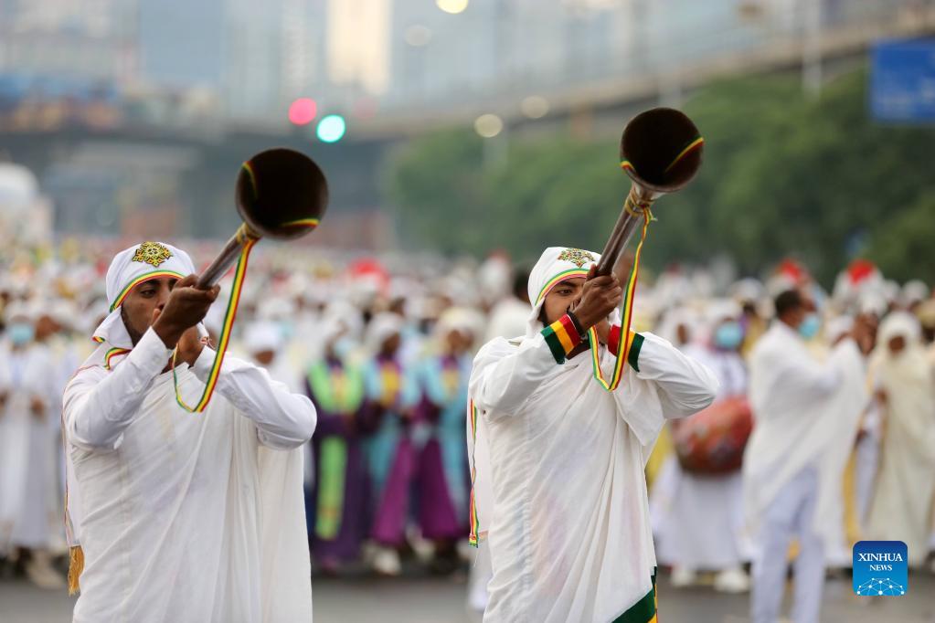 People gather in celebration of the Meskel Festival in Addis Ababa, capital of Ethiopia, Sept. 26, 2021. Ethiopian Orthodox Christians on Sunday marked the two-day Meskel, the finding of the True Cross, celebrations with various religious and cultural activities. (Xinhua/Wang Ping)