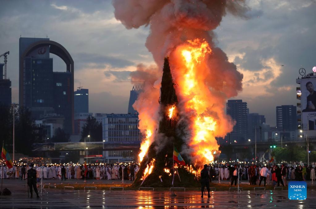 People burn a large bonfire in celebration of the Meskel Festival in Addis Ababa, capital of Ethiopia, Sept. 26, 2021. Ethiopian Orthodox Christians on Sunday marked the two-day Meskel, the finding of the True Cross, celebrations with various religious and cultural activities. (Xinhua/Wang Ping)